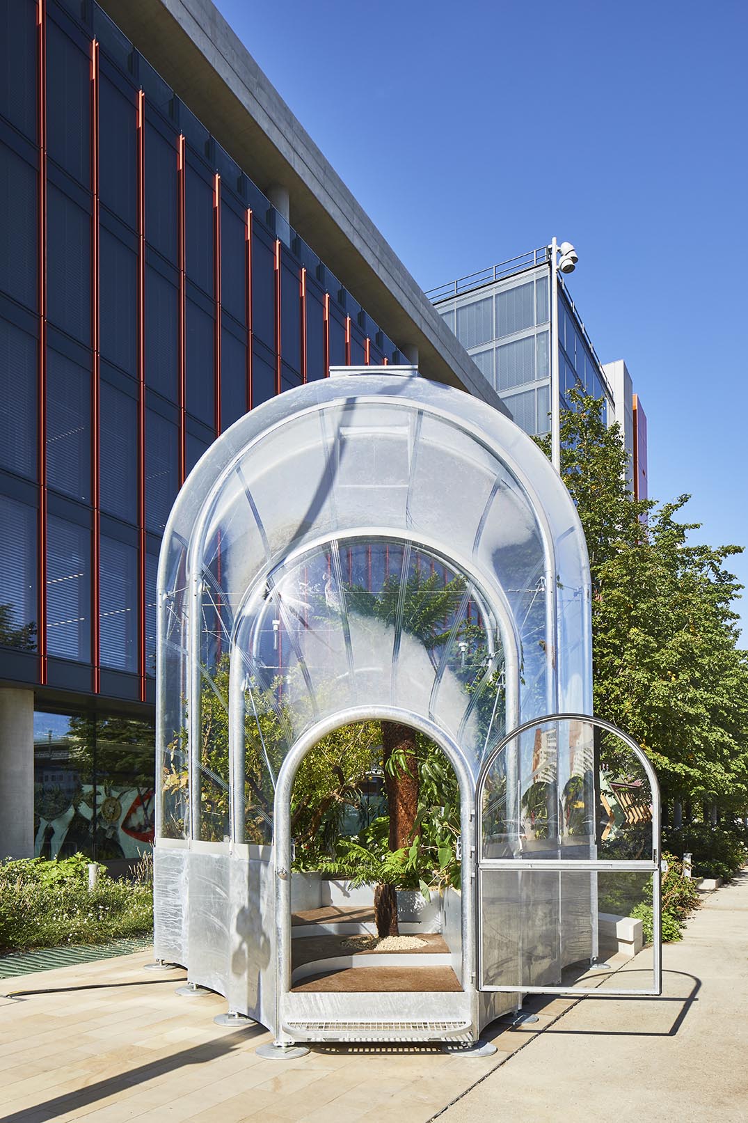 The Hothouse at IQL Stratford, East London, served as the landmark pavilion for London Design Festival 2020, exploring the impact of rising temperatures on UK flora. Encapsulating pomegranates, lemons, date palms, and avocados, it presents a striking blend of beauty and urgency.