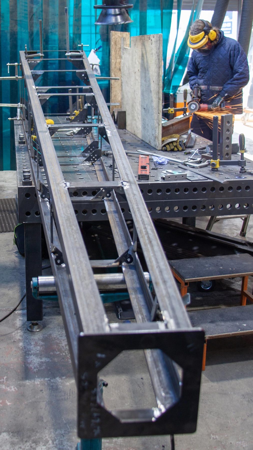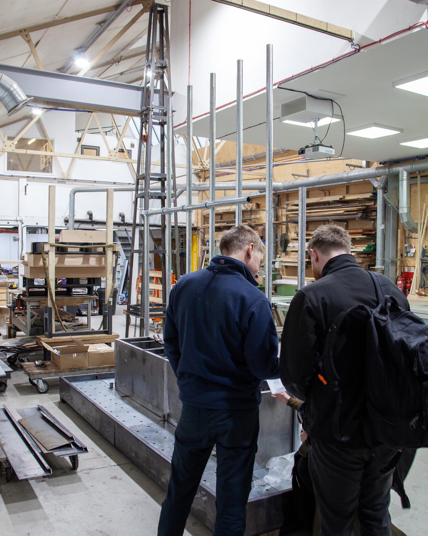 A simple, lightweight, external frame was constructed from modular steel tubing, within which the viewing ‘steeple’ was suspended via steel cables. The steeple itself is formed from a lightweight mild steel frame, clad in mirrored material on both inner and outer surfaces, open to the sky for viewing from beneath.