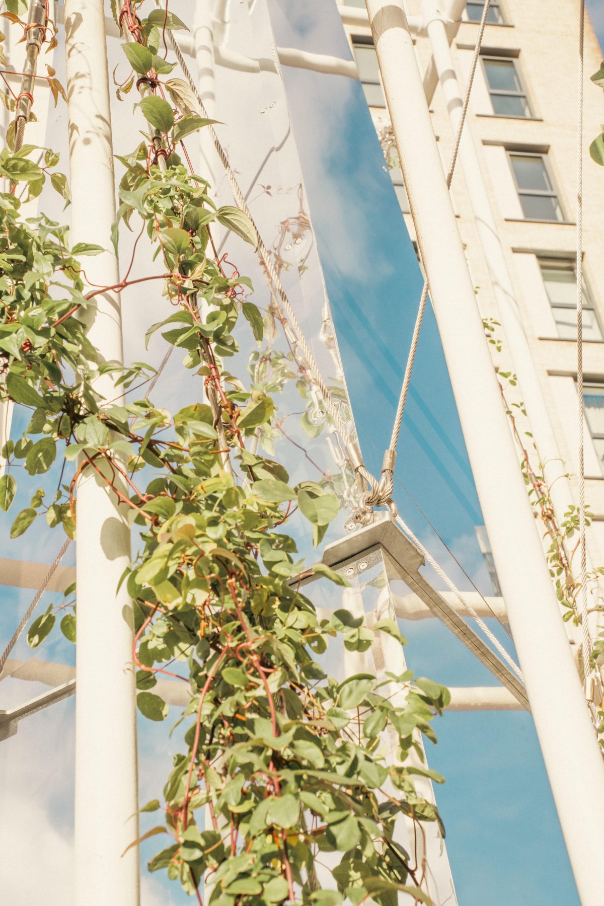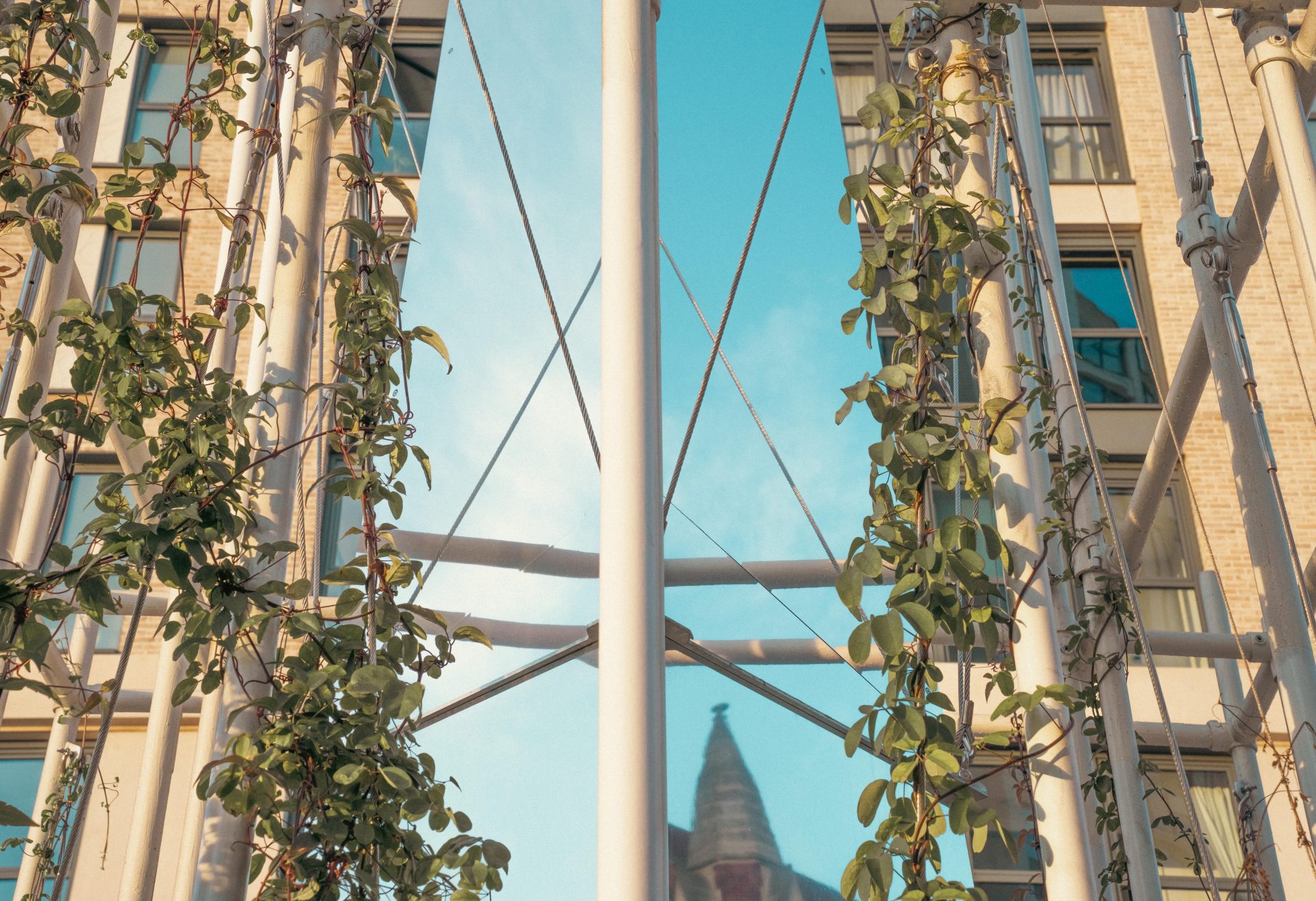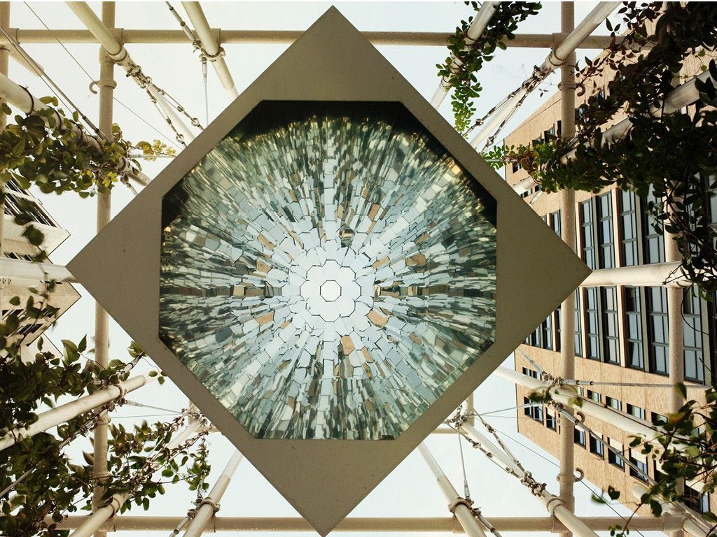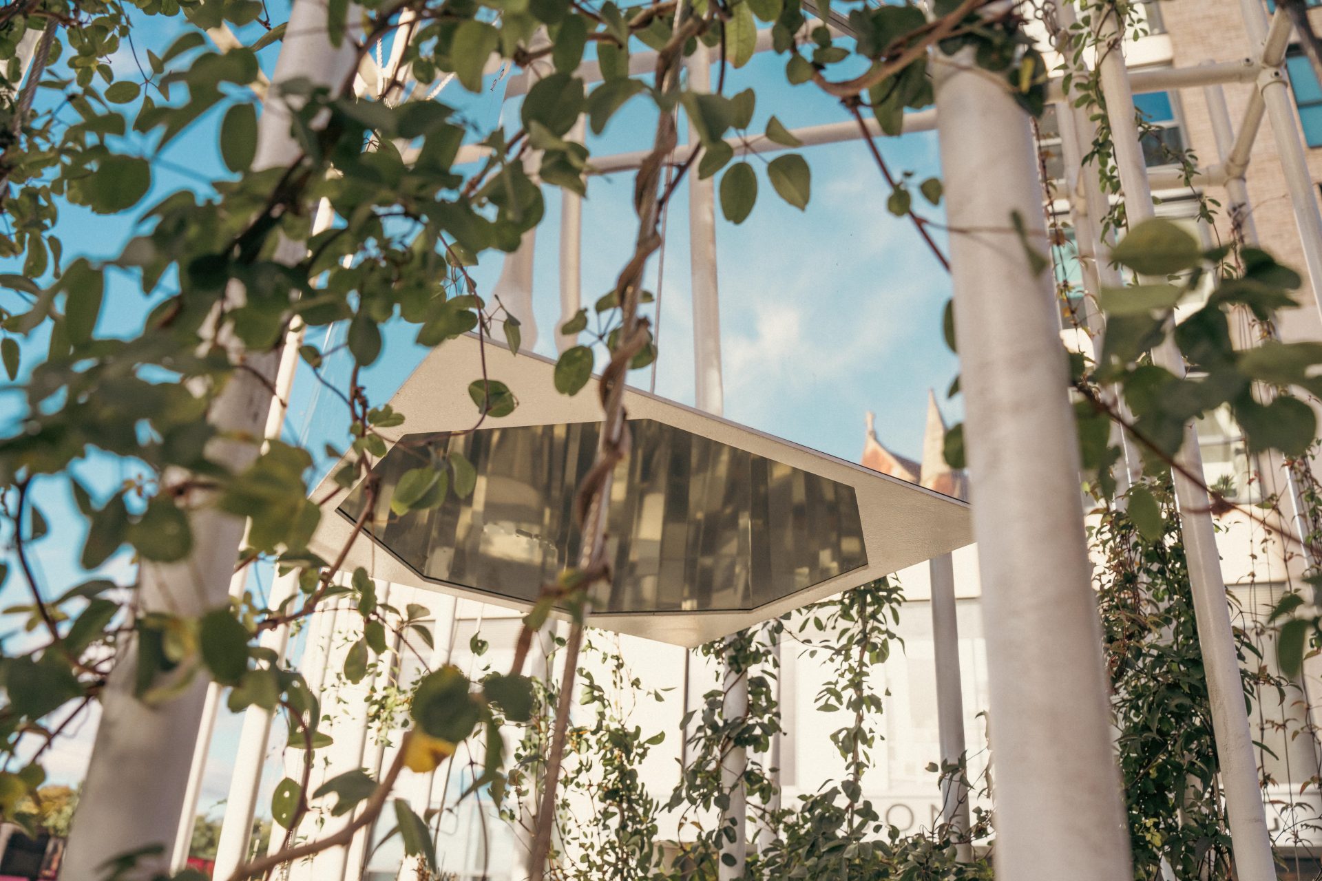 The designer’s intention for this public artwork was to form an accessible Observation Device, inspired by the central geometry of a kaleidoscope’s changing patterns. This attracts people to enter the artwork’s shade and observe with it. The vertical structure protects and supports the steeple, encouraging vines to grow on it, creating a seasonal, living artwork.
