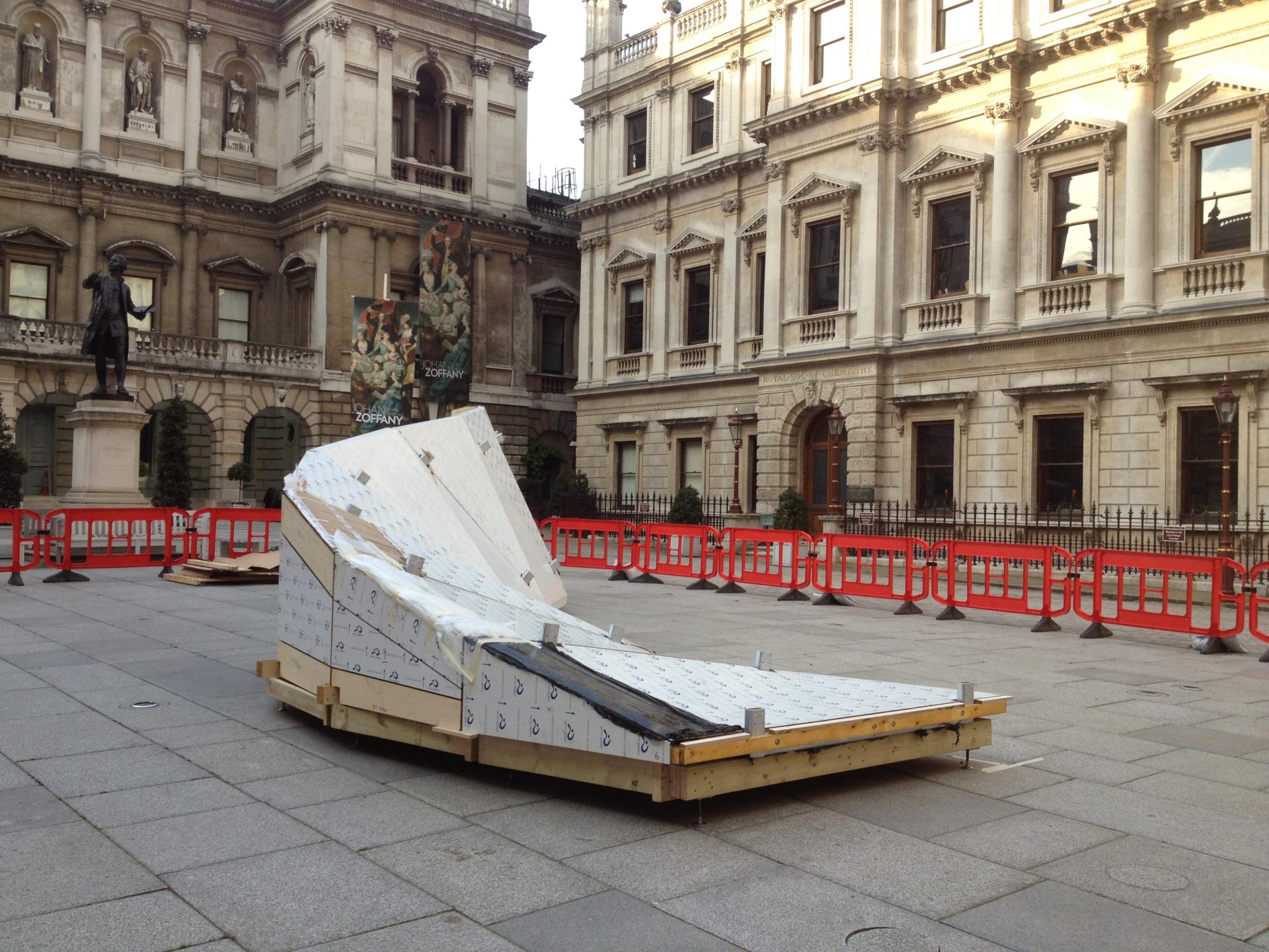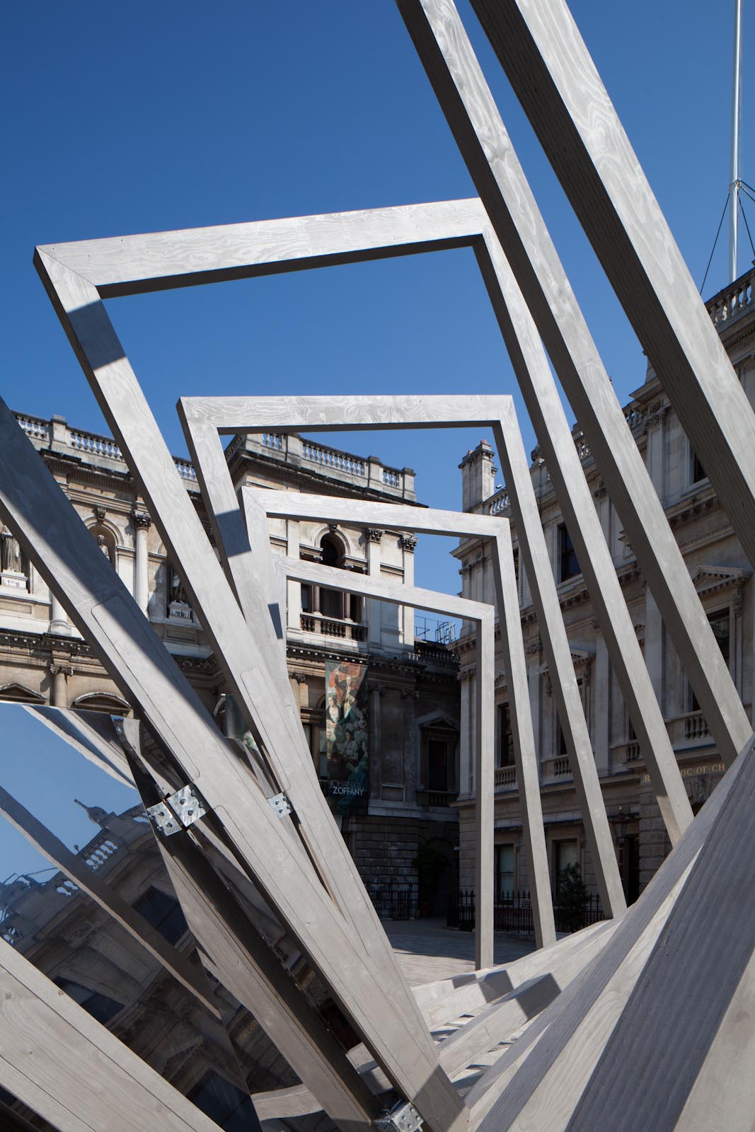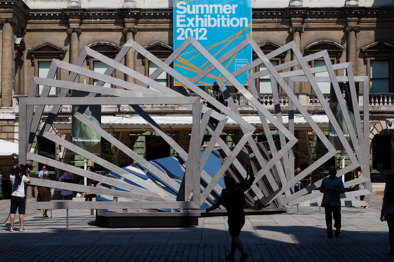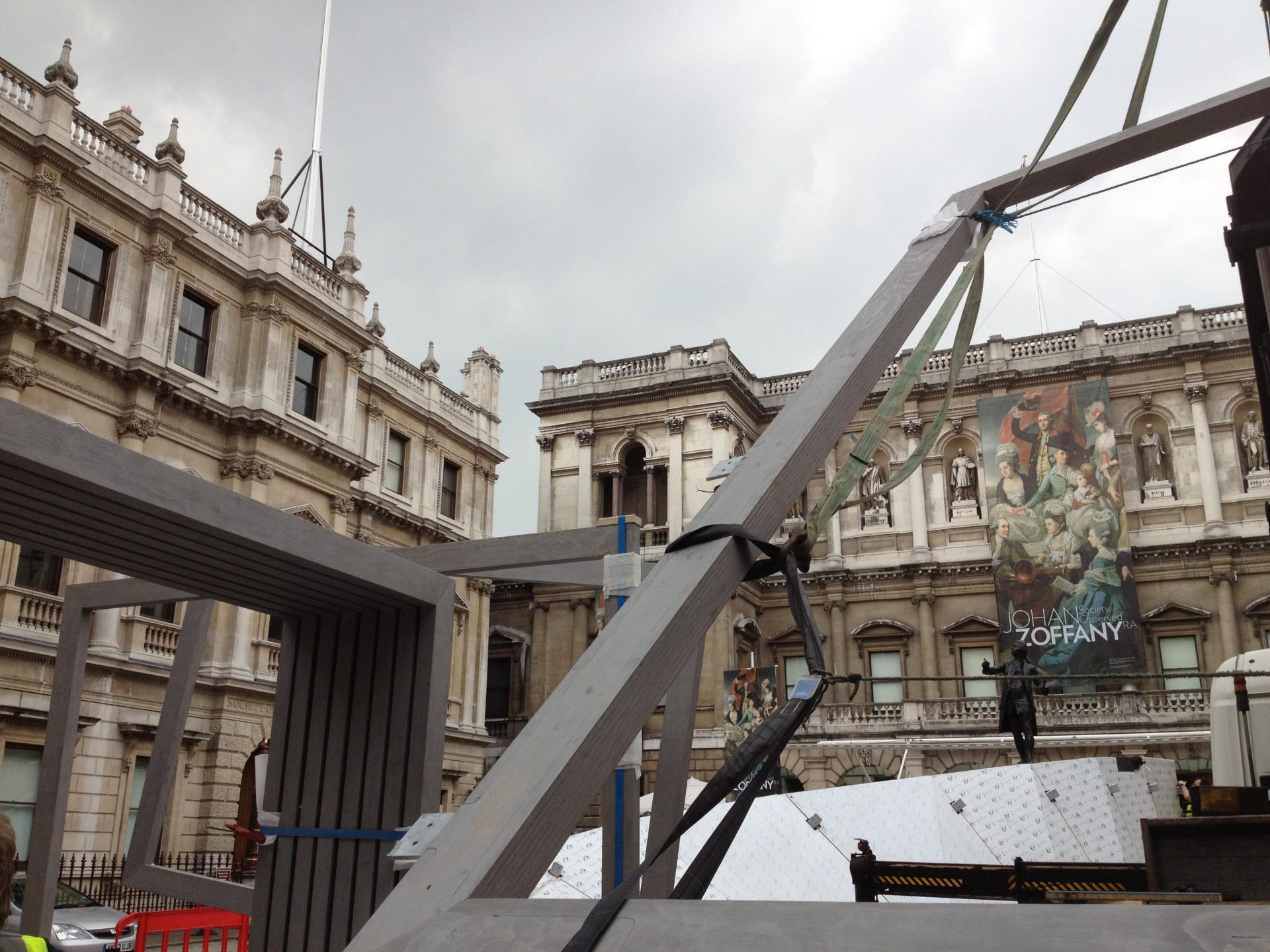 The sculpture was designed in modules to be transported to the RA courtyard and assembled via Hiab crane. With minimal intervention permitted (no ground anchorage) the structure was held down with temporary ballast placed within its frame. After the Summer exhibition, the sculpture was relocated to a semi-permanent location in Canary wharf