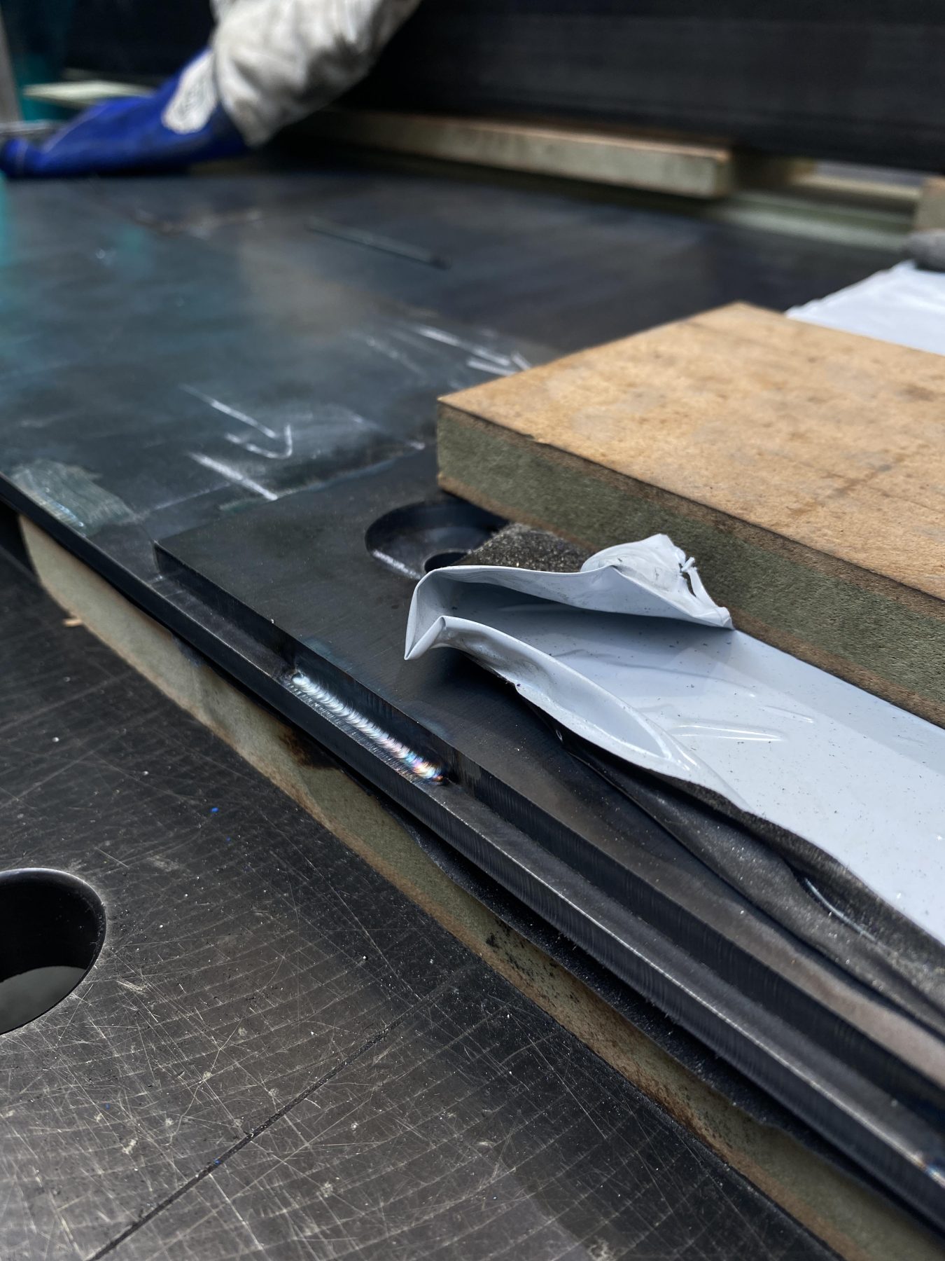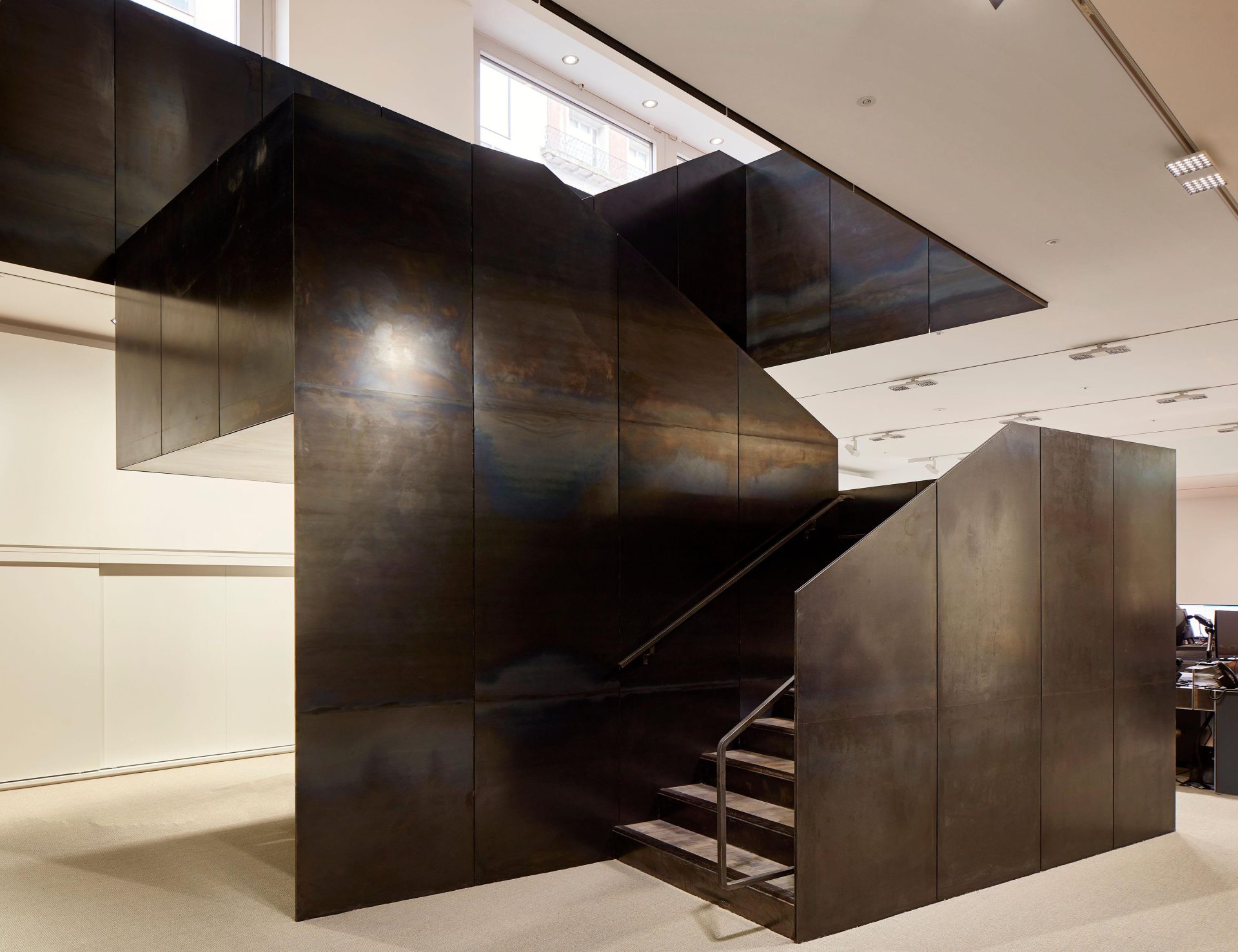 The stair is fabricated from consecutively selected panels of raw mild steel, in a waxed finish, highlighting the subtle heat marks and colouring formed during the manufacturing process of the material.