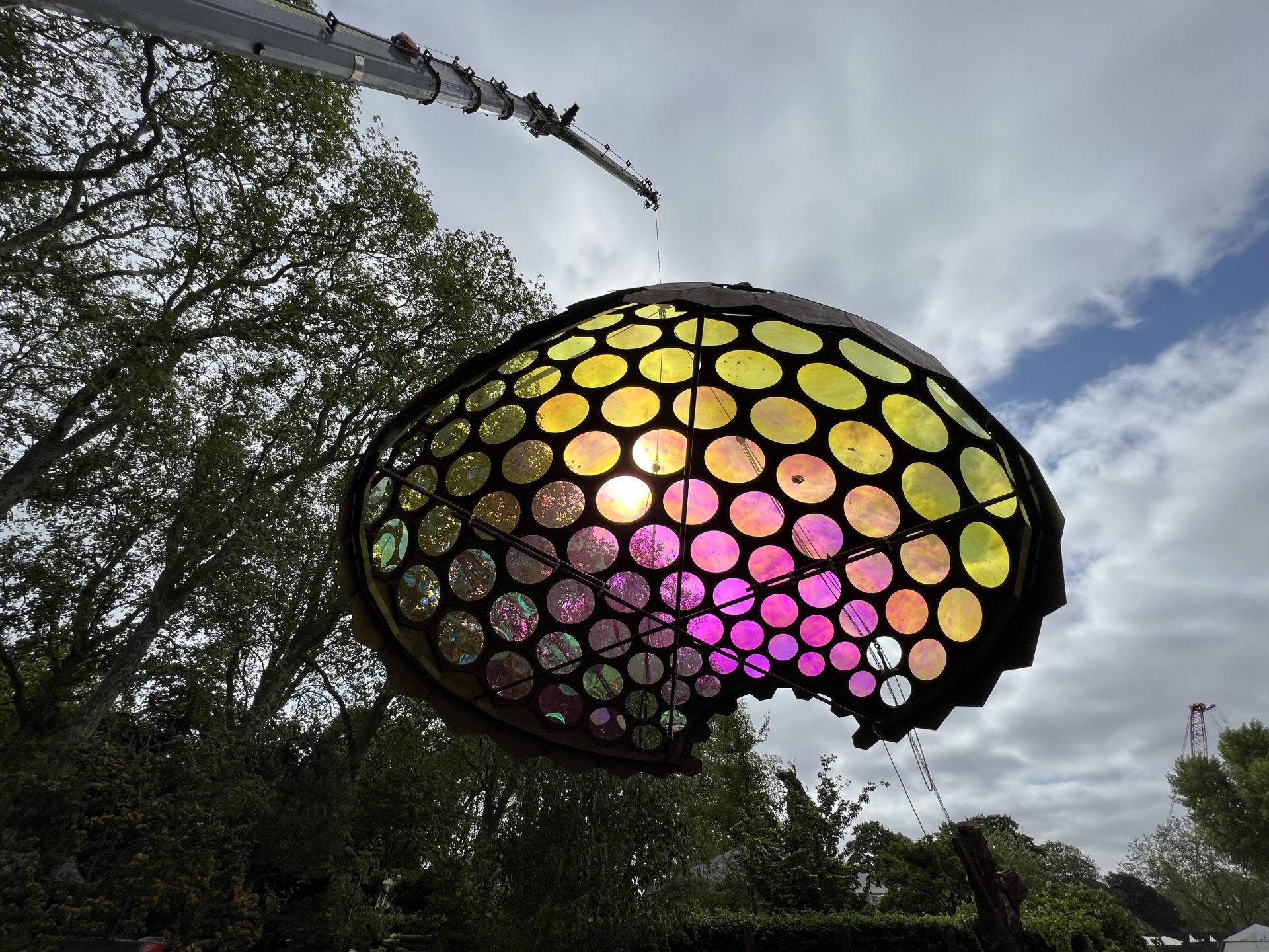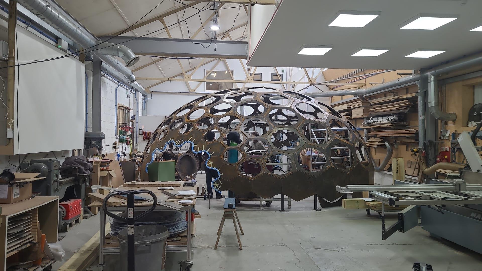 The dome was fabricated using thin-gauge hexagonal flat panels cut and assembled to exacting tolerances, allowing the nominal nodes to lock into a stable, shell-like structure. The lightweight construction enabled rapid assembly and dismantling while still meeting structural demands for both the Chelsea environment and its long-term installation at IQL Stratford.