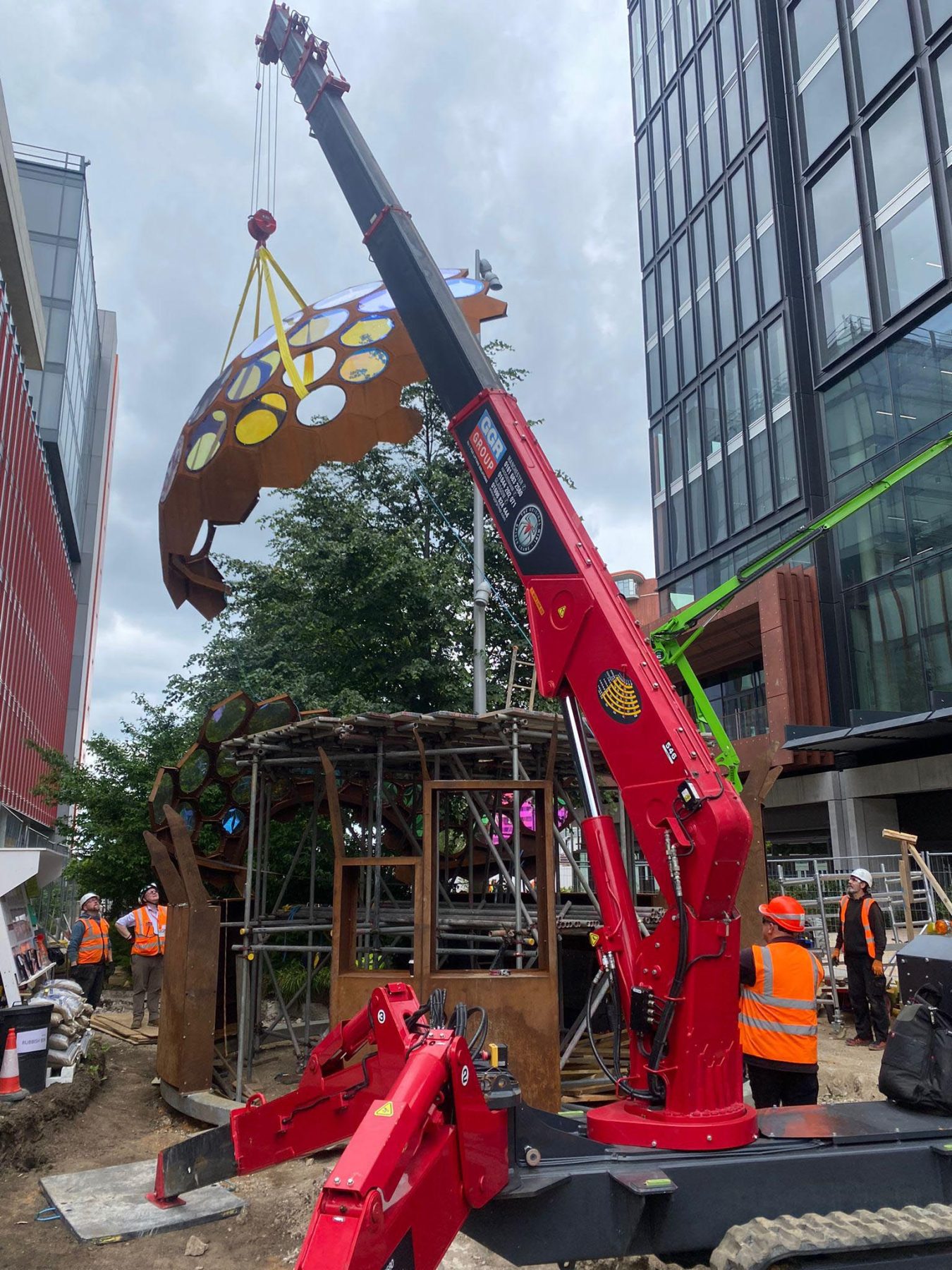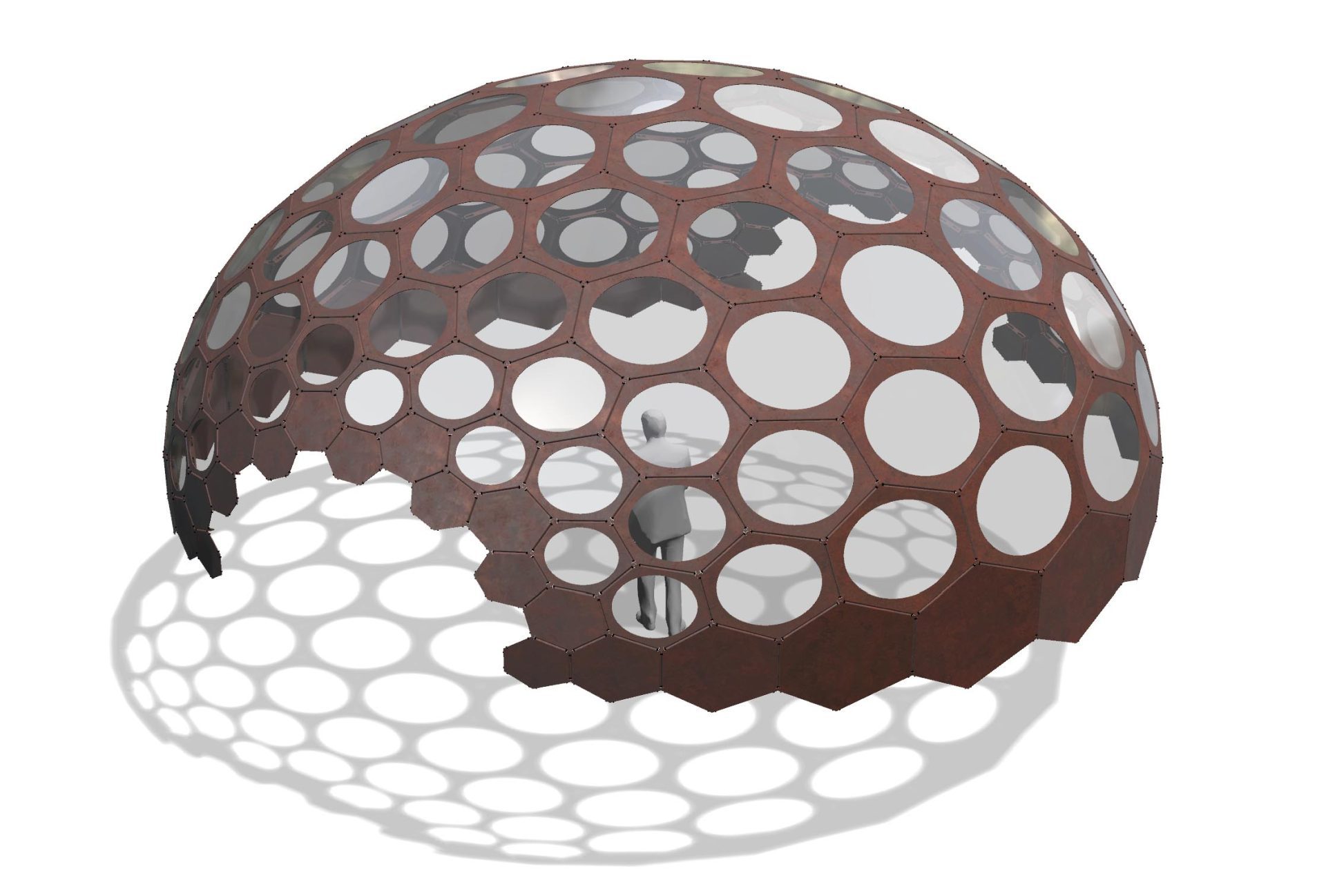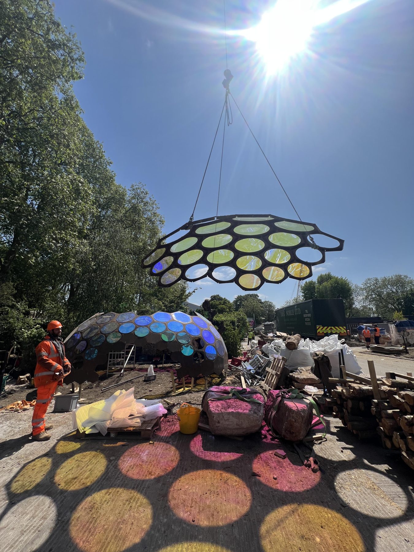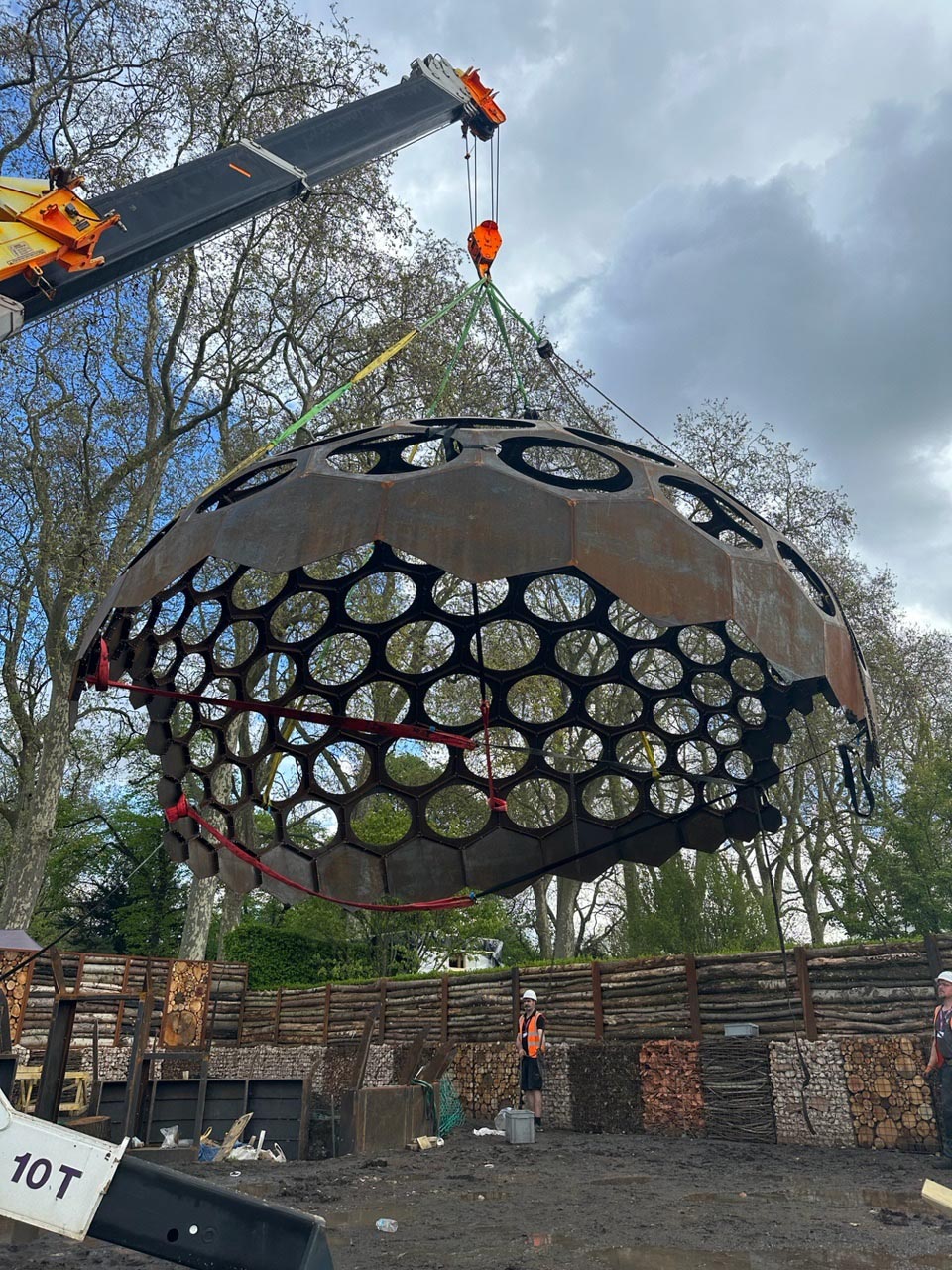 The dome was fabricated using thin-gauge hexagonal flat panels cut and assembled to exacting tolerances, allowing the nominal nodes to lock into a stable, shell-like structure. The lightweight construction enabled rapid assembly and dismantling while still meeting structural demands for both the Chelsea environment and its long-term installation at IQL Stratford.