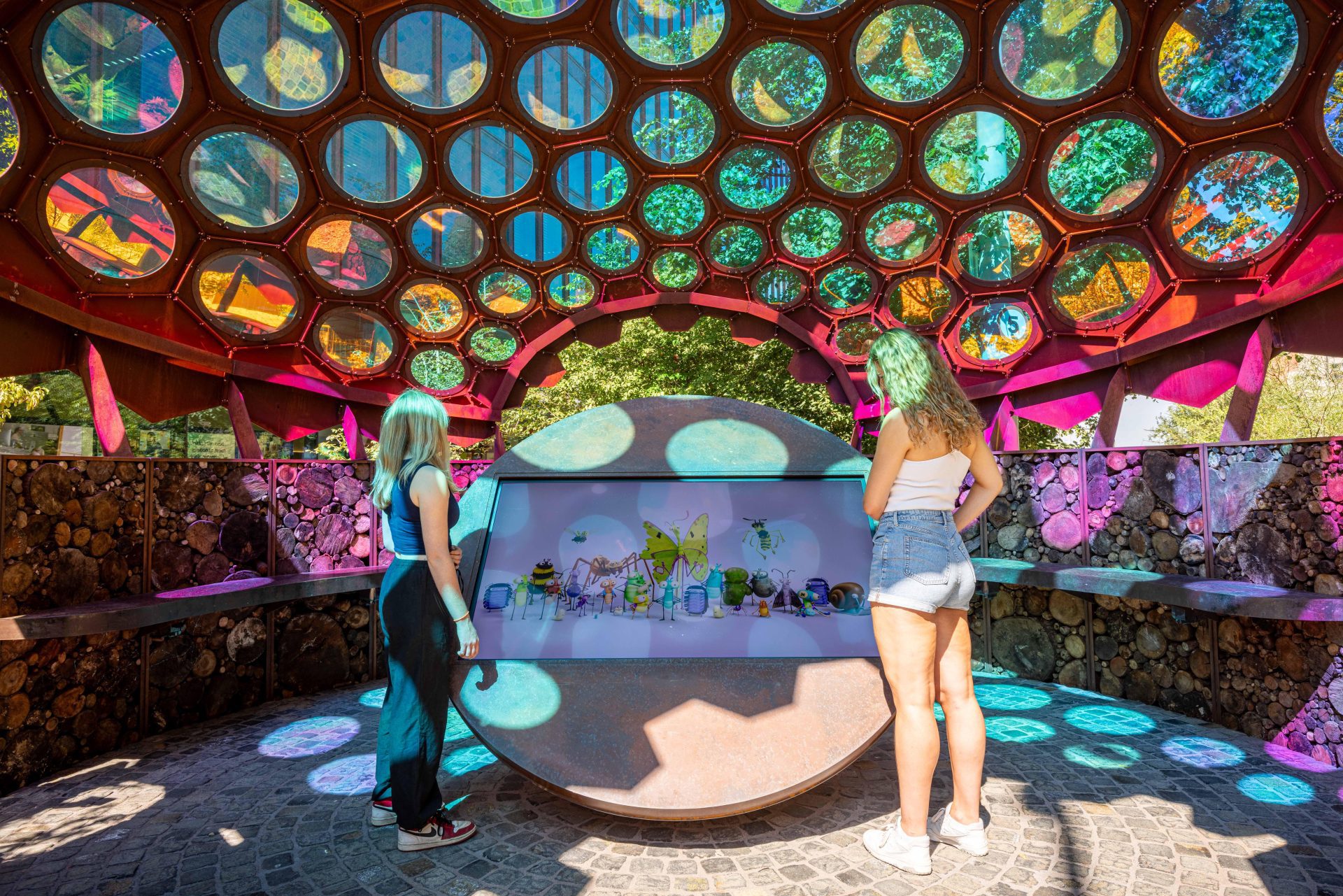 The windows of the pavilion were formed from polycarbonate with a dichroic film, creating an iridescent effect reminiscent of insect eyes.