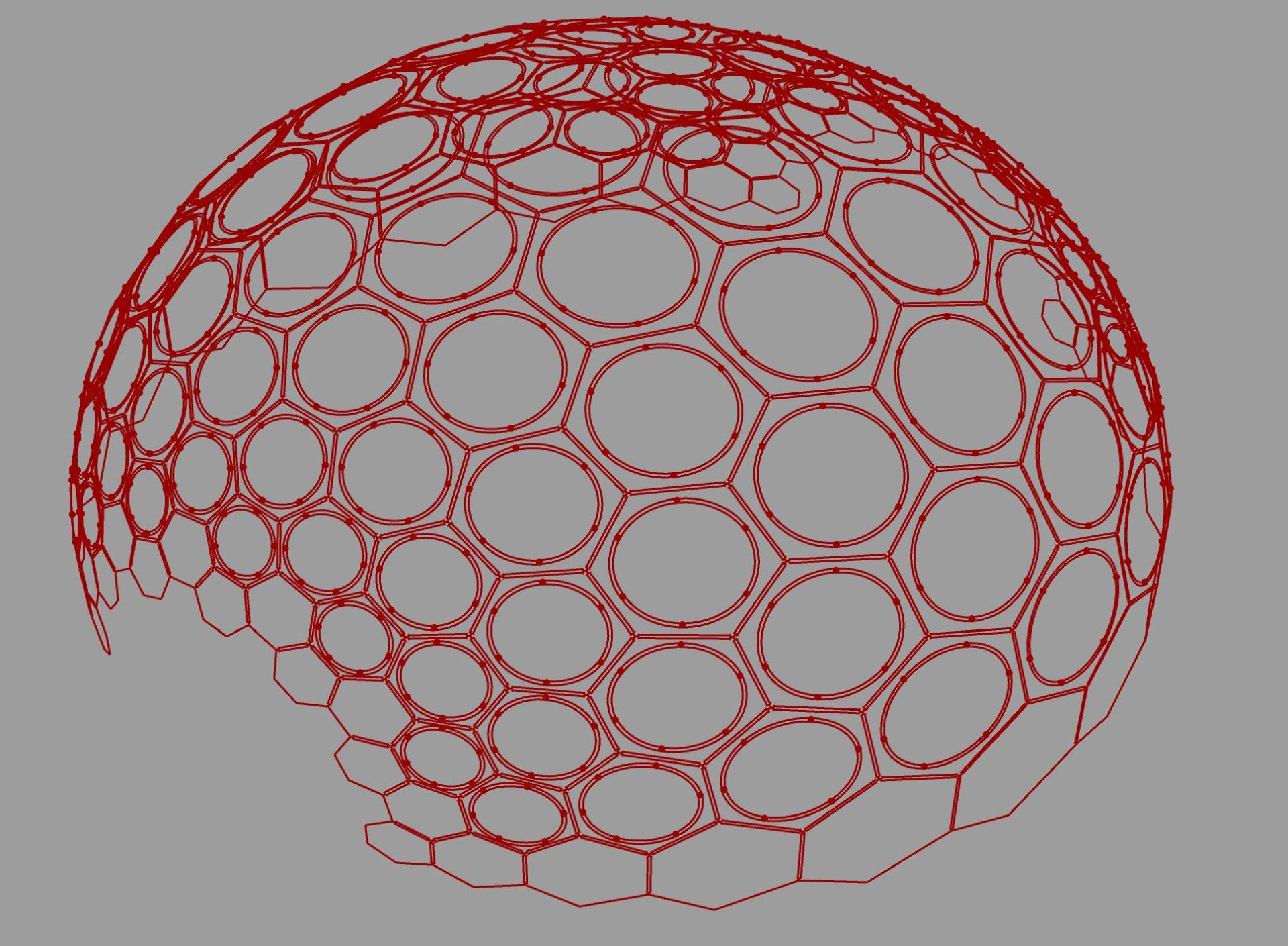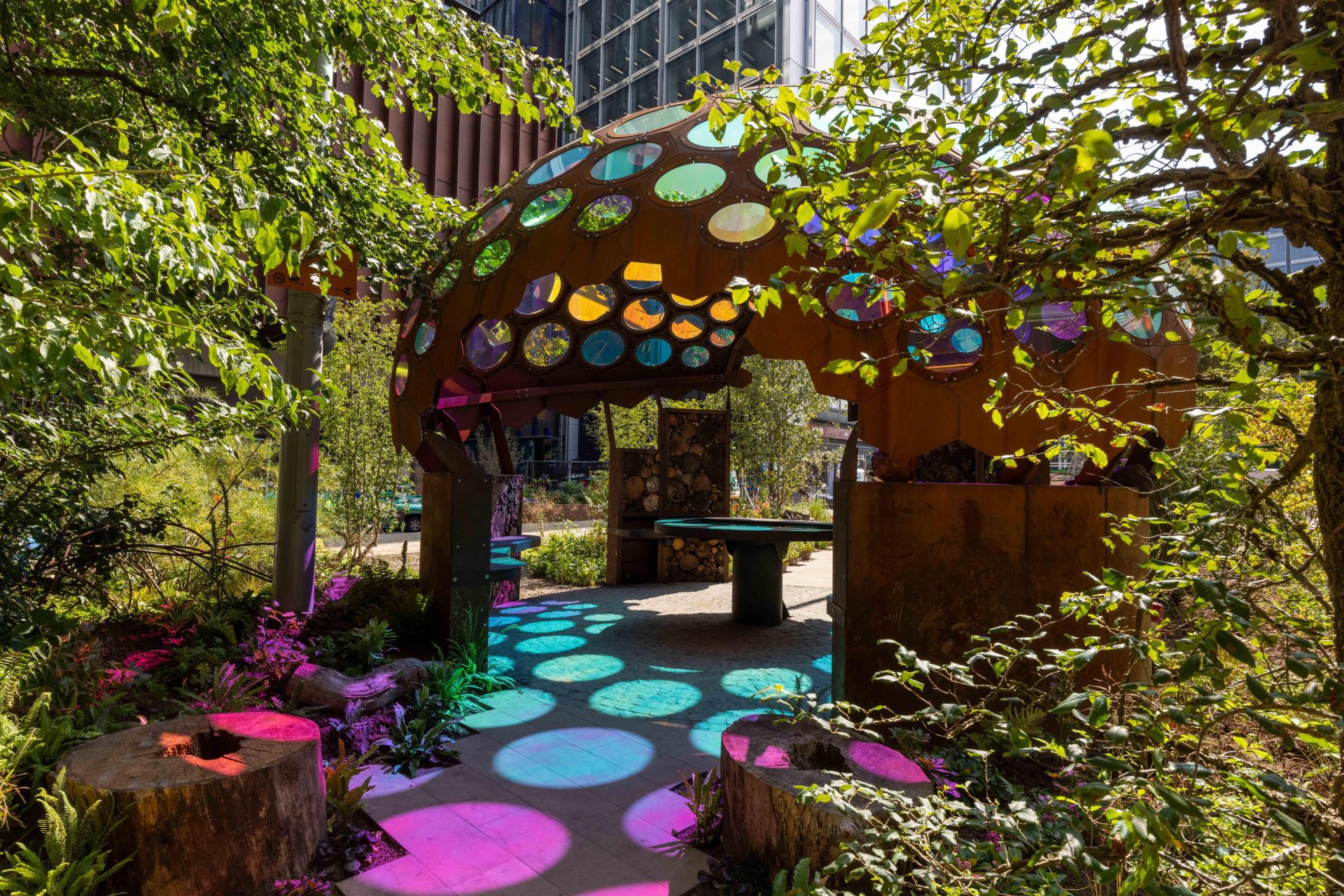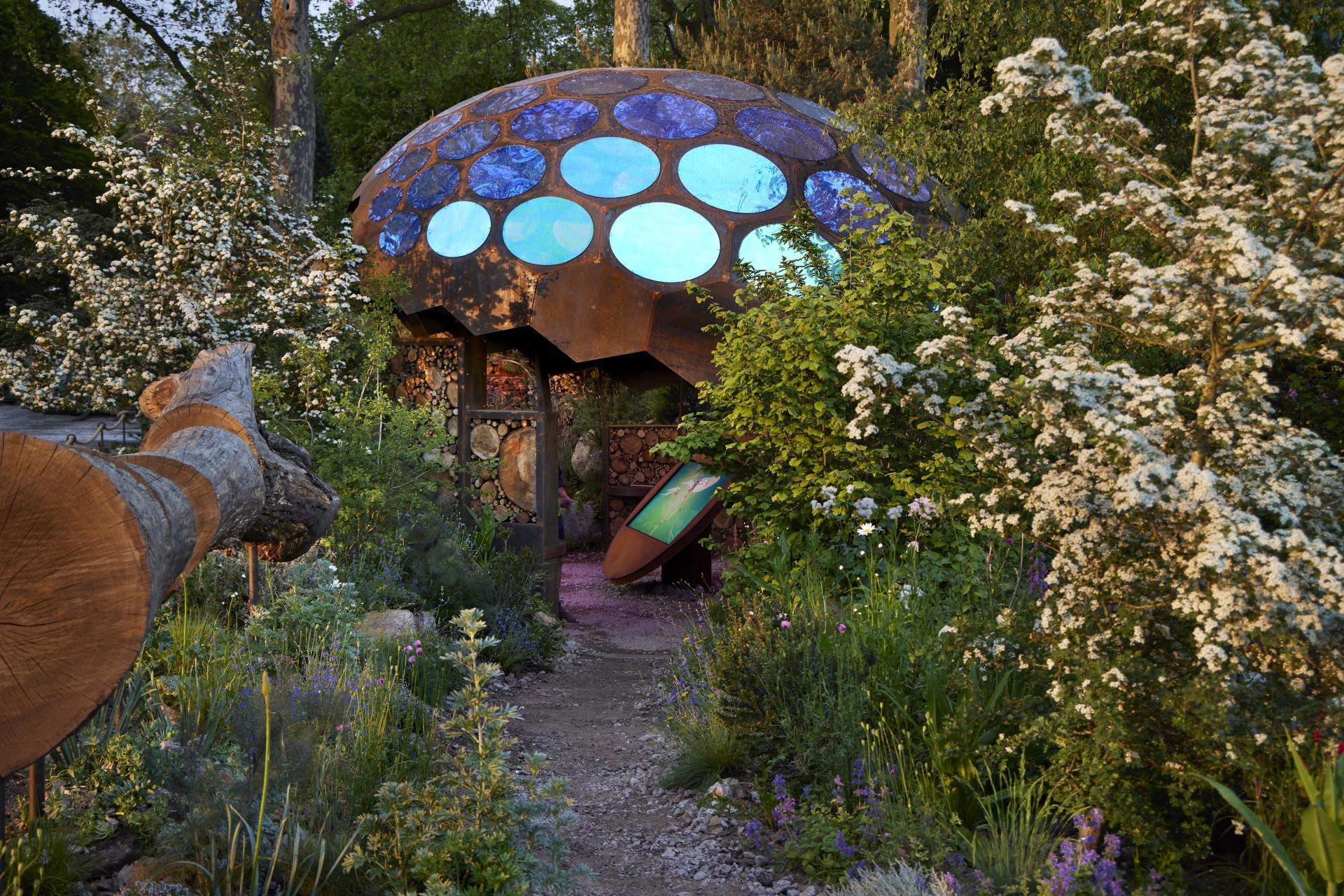 At the centre of the garden was the teaching pavilion: a lightweight dome modelled on the compound eye of an insect. Its geometry was developed using the Spaceplates system by Anne Romme, N55 and Anne Bagger. The system uses flat hexagonal facets arranged so their nominal nodes behave structurally like a true dome. Despite a structural thickness of just 3 mm, the final 7 m diameter form was engineered to withstand wind loads at its permanent location in Stratford, East London. The engineering drew on research by Anne Bagger and performs similarly to nodal domes pioneered by Buckminster Fuller.