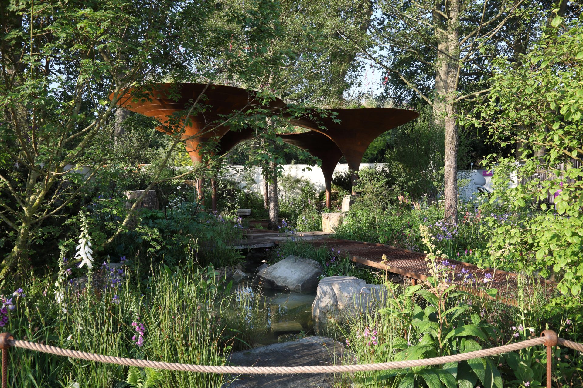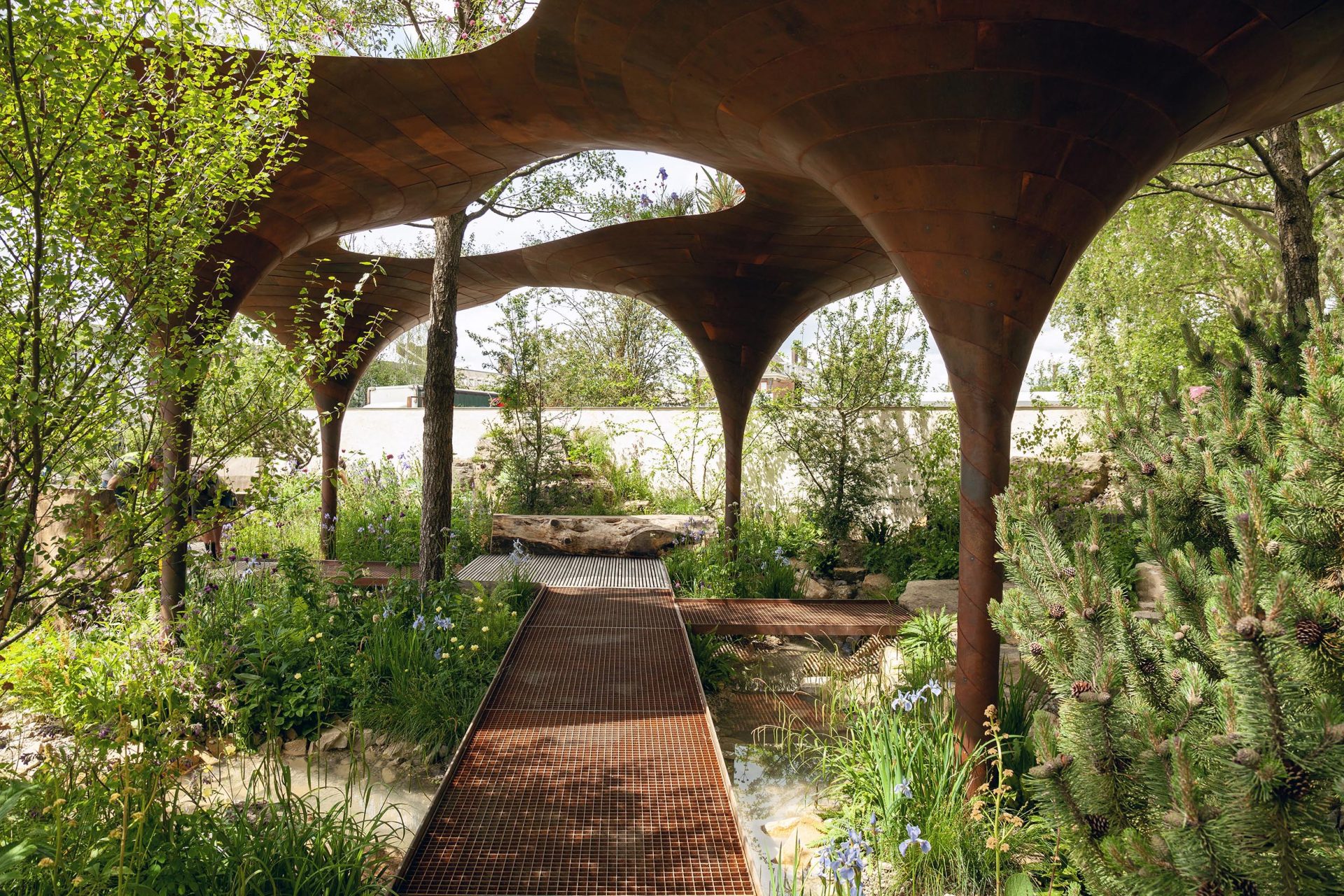 Cake Industries were commissioned to carry out the fabrication & structural engineering of a feature pavilion for the Wateraid show garden in the main avenue at Chelsea Flower Show 2024. The WaterAid garden explores the challenges presented by an ever-changing climate with the pavilion’s funnel-like form harvesting rainwater, providing shade and sustaining planting on the canopy above.