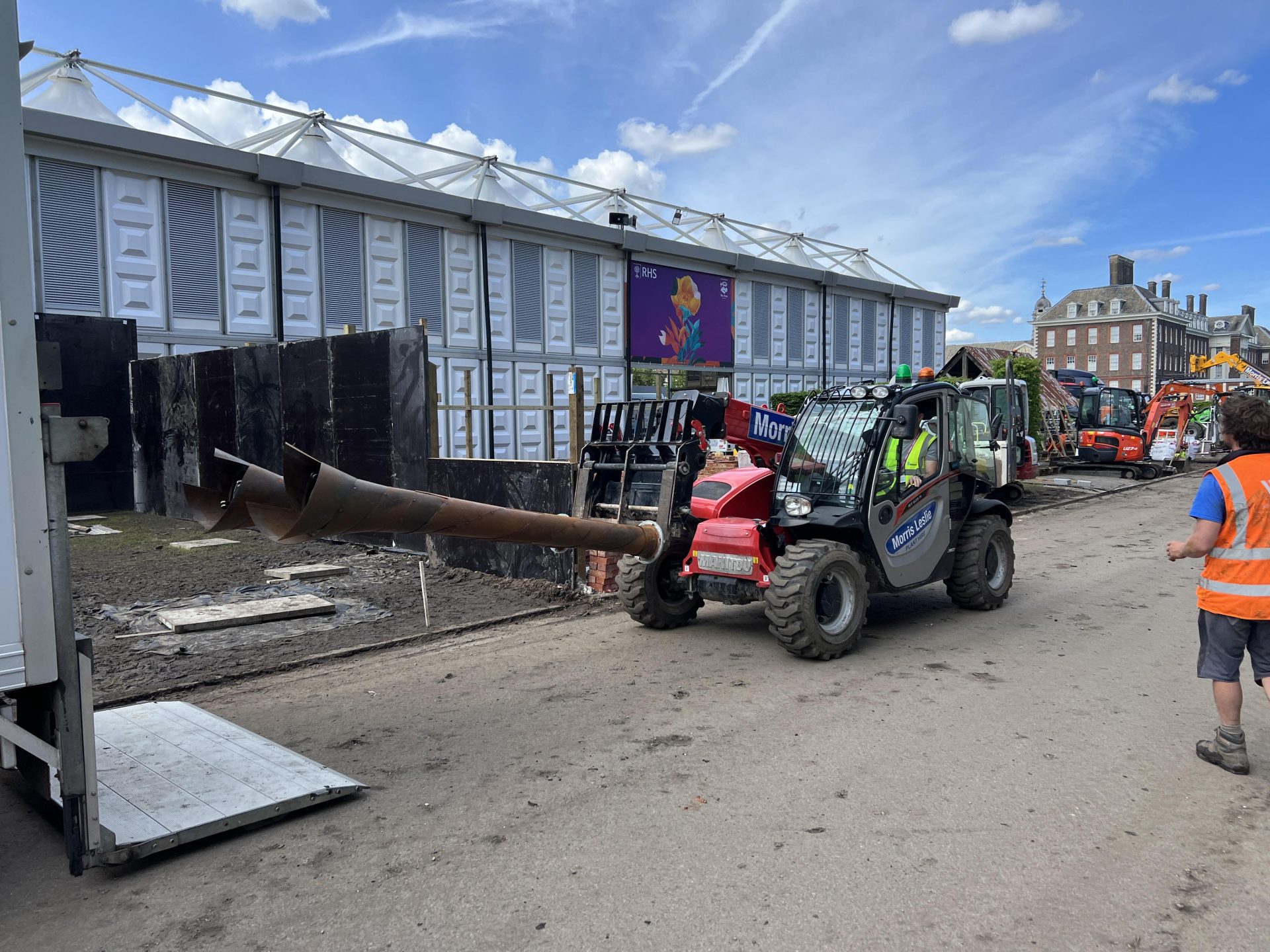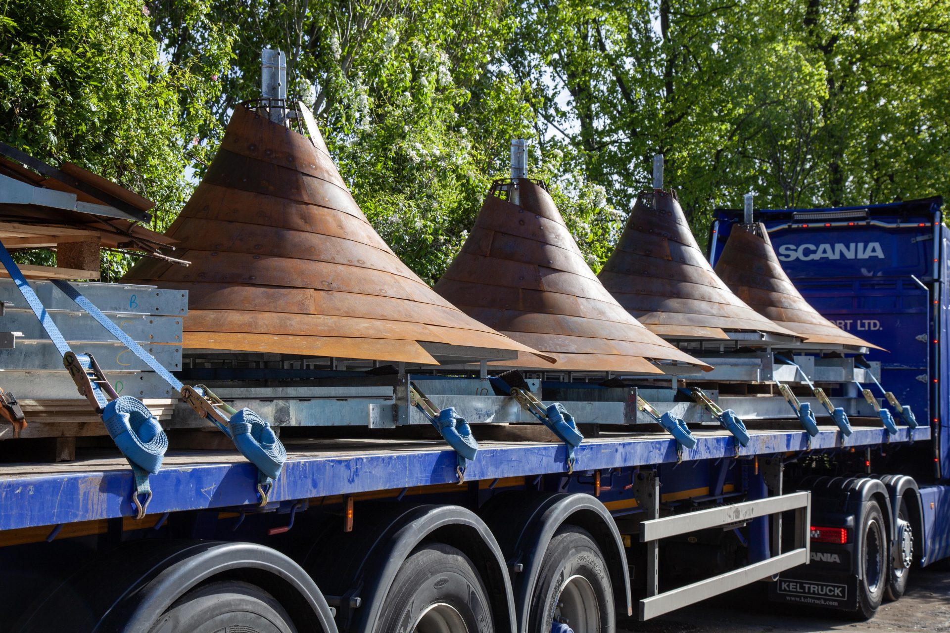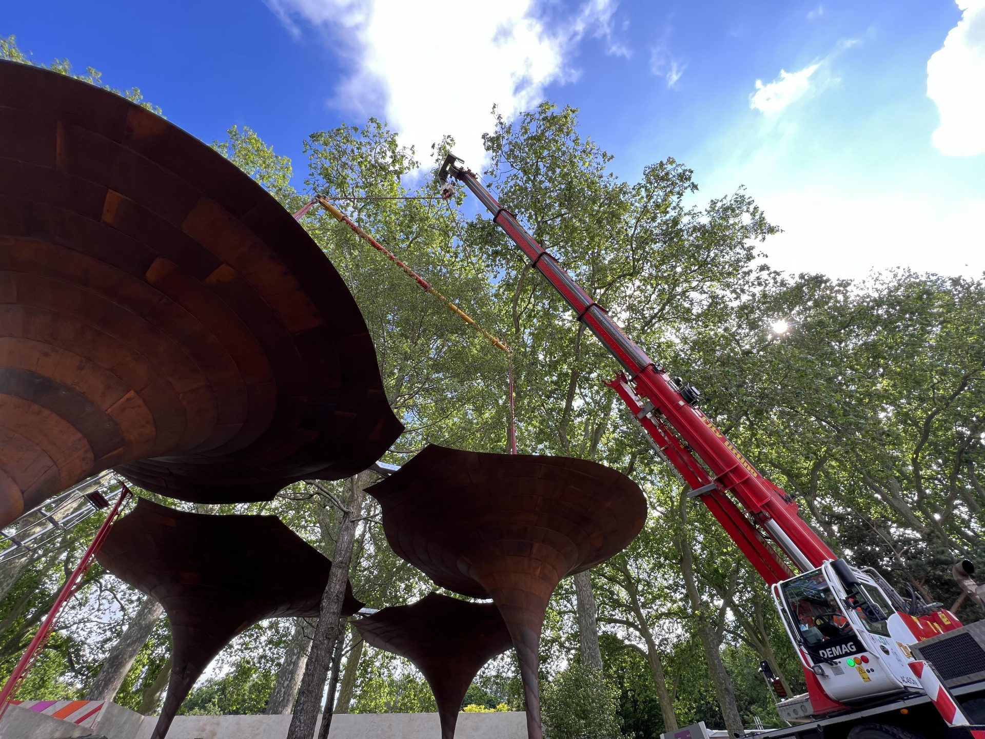 Given the narrow window for installation and intended relocation, the structure was designed in four modules that can be separated from the columns and each other for transport. Screw pile foundations were installed to support the four columns and the canopy fixed together on the ground before lifting into position as one.