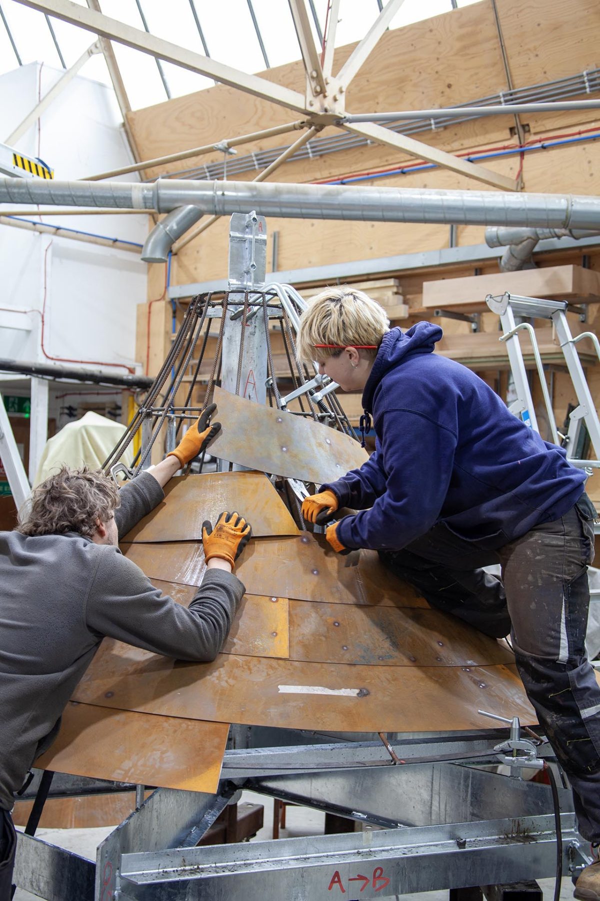 The structure is fabricated from recyclable weathering-steel and reinforcing bar, which are widely available materials, allowing potential for replication. In line with the idea of conserving and protecting our natural resources, the pavilion is engineered to be very ‘lean’ in its use of material, with 2mm sheet steel on a lightweight steel frame supported by four circular hollow section columns.